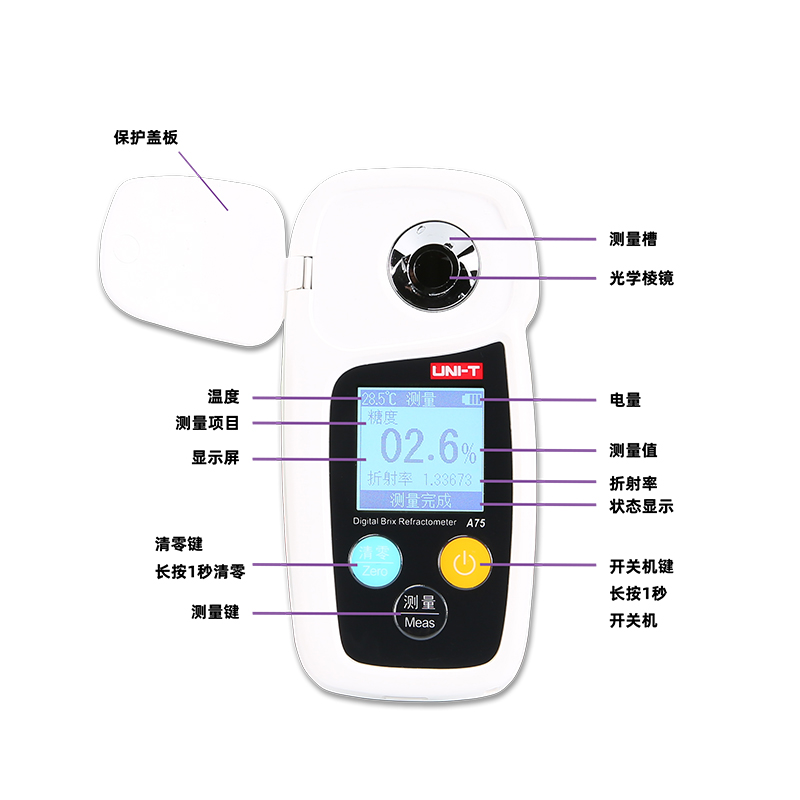 Цифровой рефрактометр A75 — это новейшая разработка компании Uni-T, предназначенная для измерения содержания сахара в фруктах, пищевых продуктах, овощах и различных растворах. Он точно и эффективно определяет концентрацию сахара и показатель преломления в исследуемой жидкости, четко отображает результаты измерений и предоставляет статусные предупреждения.