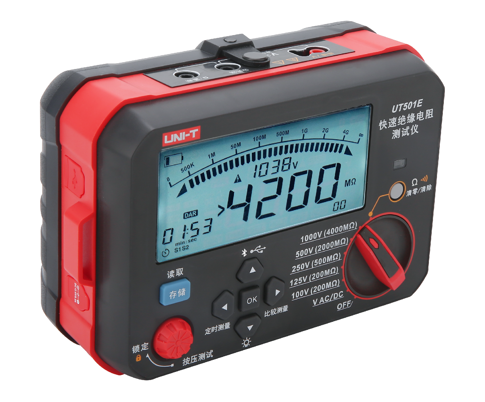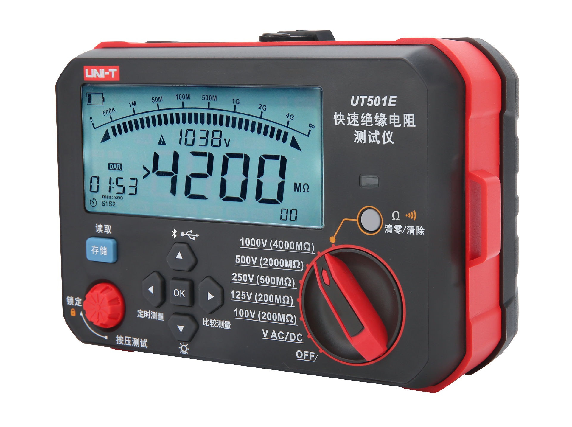 UT501E — облада быстр измерен сопротивлен изоляц, автоматическ идентификац ac/dc измерительн и низк измерен сопротивлен напряжен ключев функц продукт, этот продукц такж облада автоматическ подсветк, защит автоматическ разряд употребля безопасн, автоматическ пи и из уклп, замедлен действ измеря, сравнительн измерен, bluetooth приложен, USB., дистанцион BiaoBi тест ждат вспомогательн функц. Тесты изоляционного сопротивления широко применяются в таких устройствах, как кабеля, электромашины, генераторы, трансформаторы, громоотводы и т.д. Это обычные и жизненно важные приборы в секторе электроснабжения, телекоммуникаций, погоды, машинного отделения, нефтяных месторождений, электромонтажа и ремонта электростанций и промышленности.
